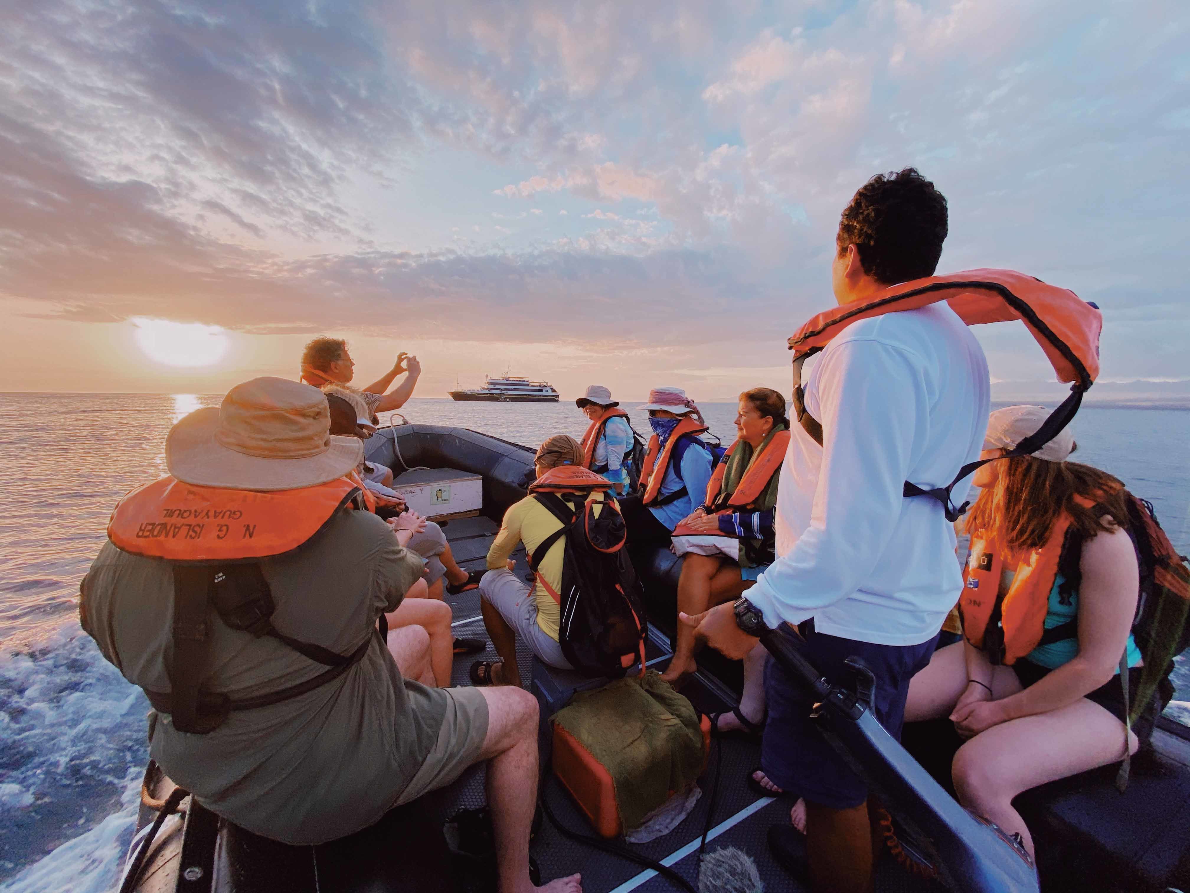 Today National Geographic Islander began with a pre-breakfast hike to the peak of Bartolome Island which has one of the most iconic views of the Galapagos Islands. Then, after a reenergizing and filling breakfast, we headed to the beach for some snorkeling, while some of our more adventurous guests took their snorkeling skills and jumped into deep water. Sea turtles, marine Iguanas, penguins, and many fish were all around us. Back on board, the hotel department served a traditional Ecuadorian buffet lunch for us, and our guests learned the proper way to eat ceviche – with popcorn and plantain chips! Later, we moved to Rabida Island where we had another opportunity to explore the underwater world. We closed the day with a beautiful sunset walk along the red sandy beach of Rabida – a perfect relaxing end to the day.