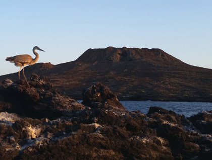 Our daily activity ended up with a Zodiac ride. The shiny sunset hidden in between the volcanic landscape of the single spatter cone of Sombrero Chino and the parasitic cones of Santiago was the perfect backdrop for penguins heading back to the shelter of their nesting sites, providing for an incredible photo opportunity. Candelabra cacti, a blue footed booby and a great blue heron joined this enchanted encounter. Galapagos is definitely a paradise, offering a privilege to enjoy it and inspiring the promise to preserve it.