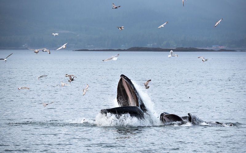 Waking up to humpbacks is one thing. Waking up to lunge-feeding humpbacks under soft morning light while flocks of red-necked phalaropes darted back and forth in the background and gangs of gulls circled overhead, is quite another. The circling gulls revealed the position of the next explosion of wildlife: gaping jaw, spray, baleen, and scattering bait fish. For over two hours we followed the birds and marveled at the whales. By the time we pulled away, we still had a full day ahead of us.
