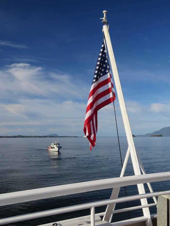 Today we re-entered the USA after four fine days in off of the coast of British Columbia, in beautiful Haida Gwaii. Our crossing of Dixon Entrance last night, contrary to earlier reports, was as smooth as many of us had ever experienced on that fabled piece of water and we arrived at our appointed rendezvous with the U.S. Customs Agents before breakfast at the entrance of the Behm Canal, abreast of Sykes Point, while the National Geographic Venture stood-off awaiting her turn for inspection. Our customs inspection proceeded without incident, and before we knew it we were back on our way to the New Eddystone Rock where many pictures were taken in beautiful, morning light.