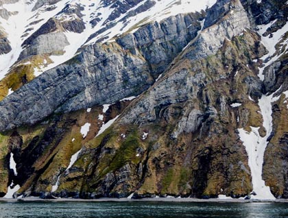 We reveled in the light on our last day of the expedition here in Svalbard.  We were revisiting the western side of Spitsbergen Island where we began our journey.  This time we would visit Bellsund, a two forked fjord with many seabird cliffs and much more vegetation than our other stops.   The morning was spent either kayaking or walking amongst some curious reindeer.  The afternoon was spent hiking or Zodiac cruising the amazing bird cliffs that make up the highlands of this fjord.  The sheer limestone walls and their tortured surfaces made a perfect ledge for the kittiwakes, murres, geese, and gulls that make this place their summer home for the breeding season.