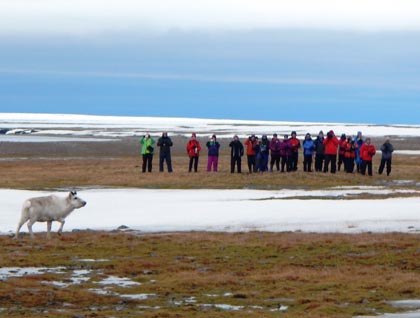 As we made our way up the beach to the moss-covered tundra, several reindeer were seen foraging on the slopes. Most of the reindeer were young ones and may have never seen humans before. A couple of them ran towards the groups to get a closer look; once satisfied that we were of no possible harm or no interest they moved on and continued feeding.