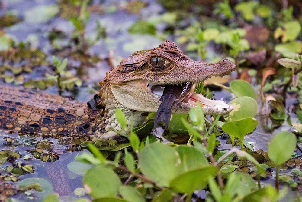 In the afternoon we planned our exploration at Dorado River. The waters here are black because it flows through the forest pulling tannins out of dead leaves of trees. Our ride began in the late afternoon in order to see life forms that are active in day light and life forms that are active in the night such as frogs, bats, night hawks and caimans! The highlights of Dorado River are not just the variety of animals of the region but also the landscape at sunset, the large lagoons glow together with the sky.