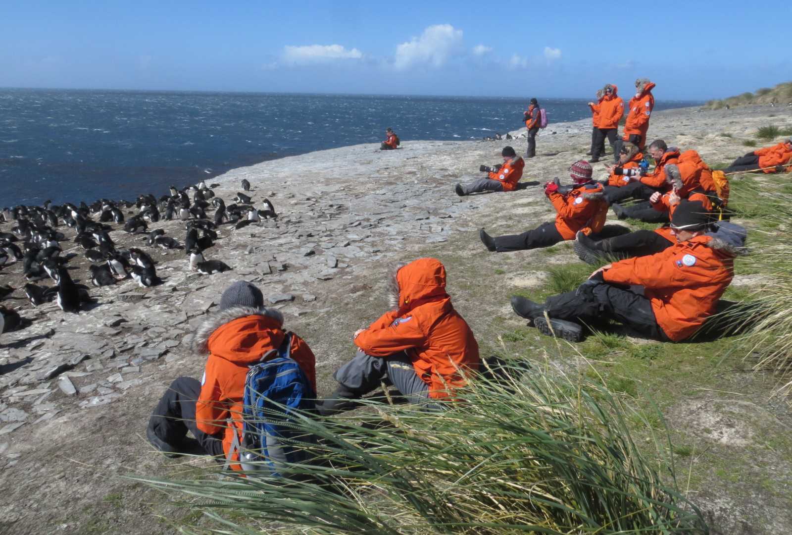 They say the Falklands are a windy place and after today, we believe them. Last night was a bumpy evening heading towards the Falkland Islands, and today we awoke to find National Geographic Onion anchored off the east coast of Bleaker Island. This low island provided only modest shelter from the screaming westerly winds that thrashed the island and had our Zodiac drivers showing off their deft skills, safely delivering us to a white sandy beach. Here we secured our hats and coats against the wind and headed out for a long hike across rolling farmland. Fluffy sheep and newborn lambs dotted the green paddocks and in many places we found upland geese hunkered down on their nests, keeping a low profile to avoid being blown away to the east. Two-banded plovers also nest here and in one instance a bird feigned a broken wing in an elaborate dance intended to lead us away from its nest. We quickly obliged. Further on, the hike reached the coastal cliffs where we found 850 pairs of rockhopper penguins sitting on their cliff-edge nests. The narrow fringe of tall tussock grass gave them some shelter from the wind and we caught glimpses of eggs tucked up underneath the incubating adults. Our morning finished, we boated back to the ship as increasing wind scoured sand off the beach. Our final destination – Stanley – awaits us this evening and tomorrow.