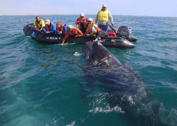 Today was the last day of gray whale watching. Guests and naturalists boarded expedition landing craft very early in the morning, and we soon discovered up to 14 cow and calf pairs at Boca de la Soledad, the northern entrance to the Magdalena coastal lagoon. Several individuals were just swimming and diving around the boats; some breeched, spy-hopped, and even lifted their heads. But later some approached us and we were able to reach out and touch them! As the morning progressed and the tide came up, it was time for us to make it back to the boat, and for the whales, time to continue their daily exercise and nursing of the babies. All of us said goodbye to these gentle creatures. In the afternoon we visited the Pacific side of Magdalena Island, called Santa Maria Bay, and its beautiful shore known as Sand Dollar Beach, where we found sand dunes, interesting vegetation, and an endless number of sand dollars and shells.