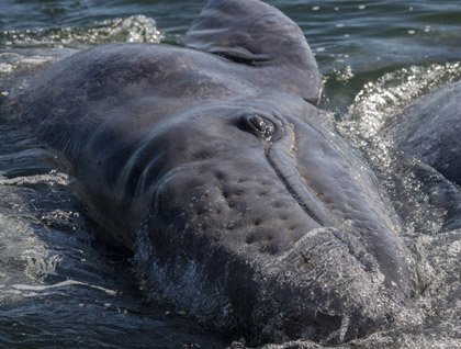 The National Geographic Sea Bird remained anchored overnight at Los Titeres, in the southern end of Boca de Soledad. We awoke this morning to 61 degrees Fahrenheit (16 degrees Celsius). The water was dead calm, which meant no wind, which also meant.... fog. Our main event of the day: getting a closer look at the gray whales by Zodiac, alternating with the option to go ashore and walk the desert dunes and shoreline.