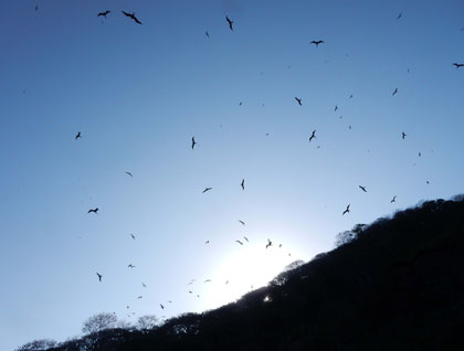 The day started with an early morning DIB cruise through the waters surrounding Bona Island. This is a fantastic place for bird watching. We were treated to the high flying antics of the magnificent frigatebirds who are masters of the wing. They soared overhead and the males wooed us with their colorful red gular pouches. The brown pelicans cruised in formation and dove into the water with impressive velocity. And the brown and blue- footed boobies dotted the shore and splashed into the waves as they fished for breakfast.