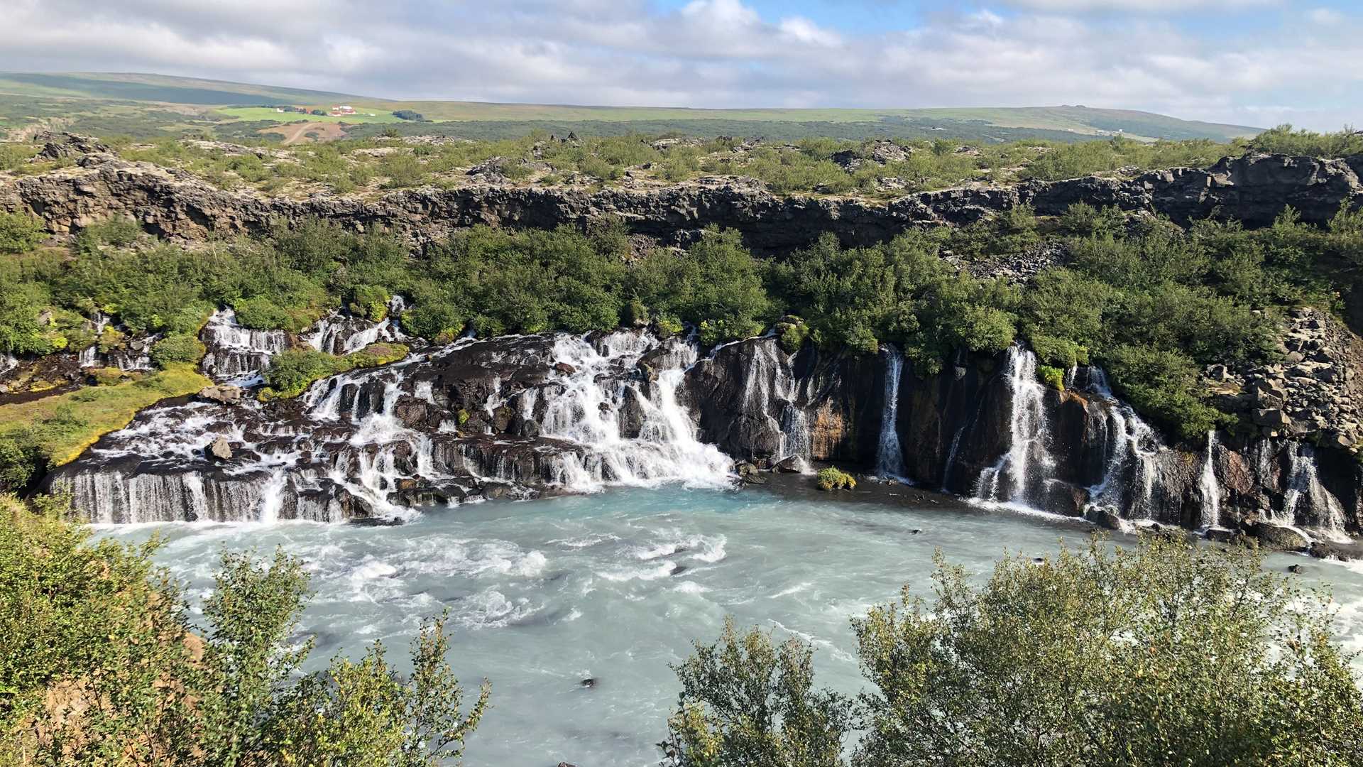 Iceland has countless breathtakingly beautiful waterfalls, and at Borgarfjörður, the Hvita (“white”) river) emerges, spring-fed, from the lava field above, carving out bridges and stone arches at Barnafoss, and cascading down to the Hraunfossar waterfalls below, which stretch for almost 1 kilometer.