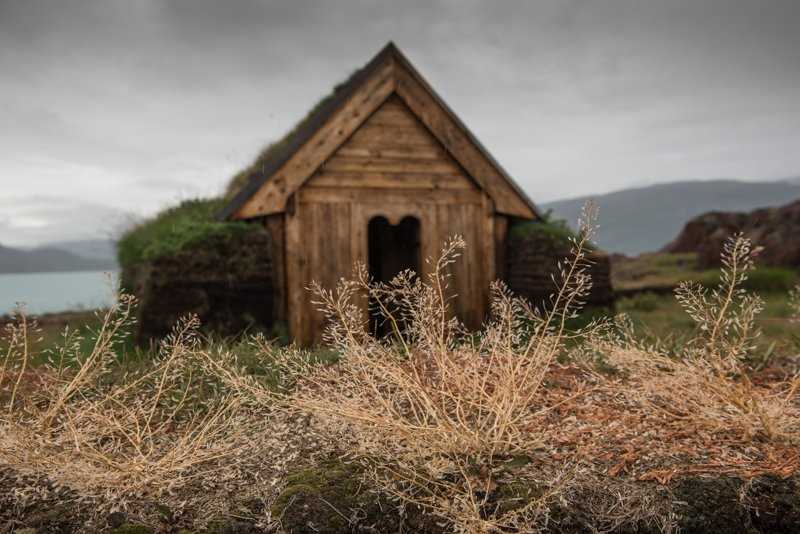 Just 50 meters away, enclosed in a low sod fence, we entered a tiny sod church. The story goes that the founder of this settlement, Eric the Red, was a lifelong follower of the Norse belief system, but it was a different story for his son, Leif. Leif went to Norway and became very interested in Christianity. When he returned to Greenland he brought some priests with him, and, according to the Sagas, Leif’s mother (Eric’s wife) became a Christian and a tiny church was built for her. Although the reconstruction is up on a hill, the ruins of the original church, called Thjodhild’s church in her honor, sit just meters away from the small modern church still used by this community.