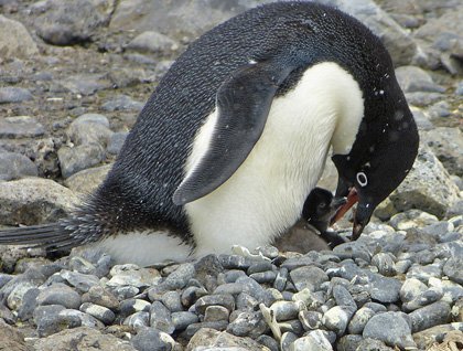We landed and left our Zodiacs (sit and spin) to set foot on the Antarctic Continent itself, where we exchanged congratulations. Down the beach, past the incubating gentoo penguins, past the lines of Adèlie penguins heading resolutely down the beach, we reached the dense colony of Adèlies. The nests of stones were packed closely, pecking-distance apart. Most of the birds were lying quietly over their two eggs. Occasionally, birds returning from a feeding foray greeted their mate with a raucous display, and then the two birds switched places, all while carefully protecting their eggs from marauding predators. We watched as incubating birds rose up and revealed their eggs to our eyes and cameras. And then came an excited shriek from one of our guests. She had spotted a small black fuzz ball under the stretching parent, and thus the first young penguin came to our attention. As we watched, we found that more of the nests were hatching. Some of the young penguins were emerging from their shells, half in, half out.