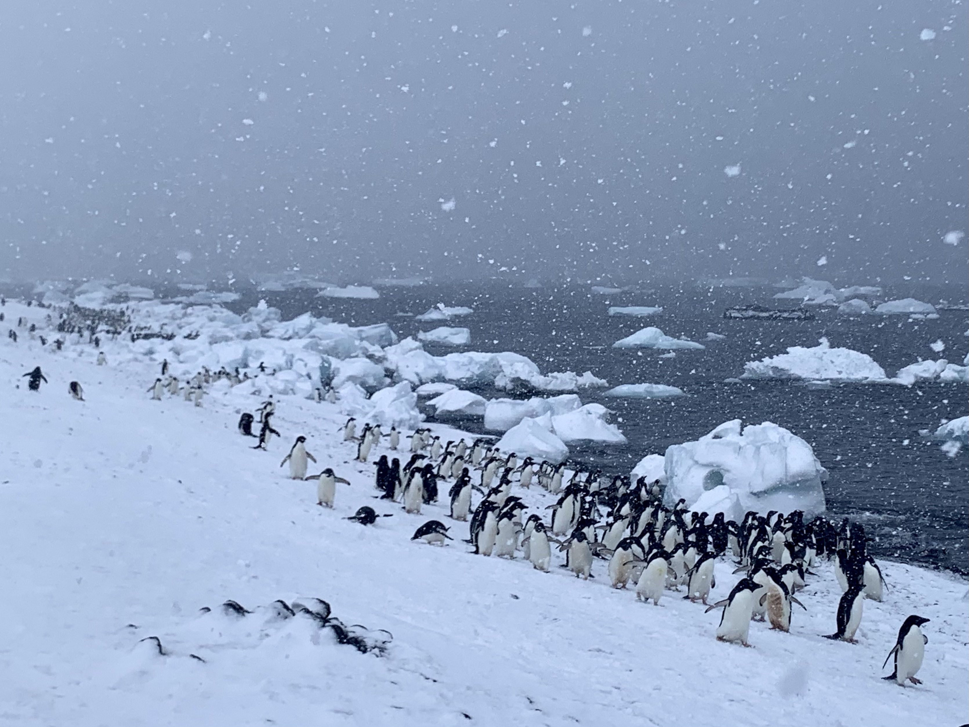 Lots of fluffy white stuff greeted us sideways, and the air temperature stayed below the freezing point. This was a “wrap up warmly” sort of landing. Large groups of porpoising penguins entertained everyone on Zodiac rides to the landing spot, where a winter wonderland greeted us. It is a spectacular sight to view thousands of Adelie penguins and a few gentoos line up by the hundreds to head out to forage in the sea. They looked a bit nervous as they passed, and rightly so. Leopard seals on penguin patrol waited along the water’s edge.
