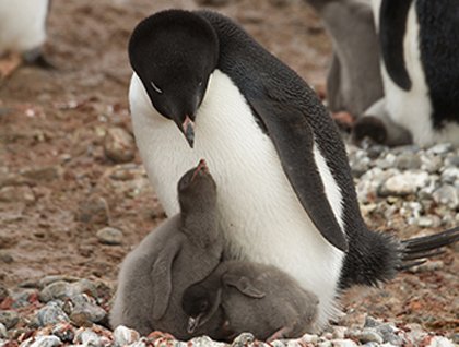 Early morning on the day of the summer solstice found us at Brown Bluff, 63 ° 28’ S, 56 ° 46’ W. It was -2°C, windless, the sea was calm, and a light dusting of snow was evident on the ships’s superstucture. An early shore landing was coordinated to visit the rookeries and glacier. Many Adelie penguins had chicks around two weeks old, and some were still incubating eggs. Gentoos also breed at Brown Bluff, but in smaller numbers compared to the Adelies. A one-mile hike took guests across a snow ridge and up a gully adjacent to a small glacier. A leopard seal lazed on a beached iceberg within sight of the pathway. Guests could pick out snow and pintado petrels wheeling overhead, and Wilson’s storm petrels that nest on precipitous ledges on the heights of the bluff. Kelp gulls, skuas and giant petrels were also frequent passers by. We were all aboard around 11 a.m. after a terrific morning ashore.