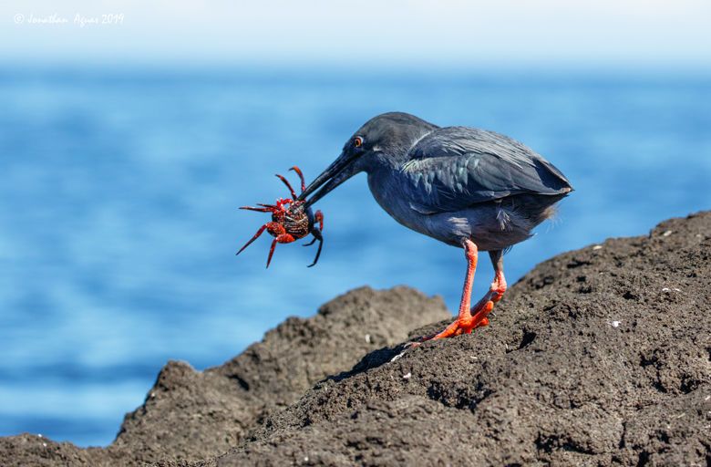 After lunch we had a wet landing on a black sandy beach. We were lucky to have a young Galapagos fur seal come up to us, investigate our presence, then go back to its mother and start nursing. We walked far into the island scouting for wildlife within tide pools left behind at low tide and found a few striated herons feeding on Sally Lightfoot crabs, great blue herons fishing around the shoreline, and a couple of Galapagos hawks flying above.