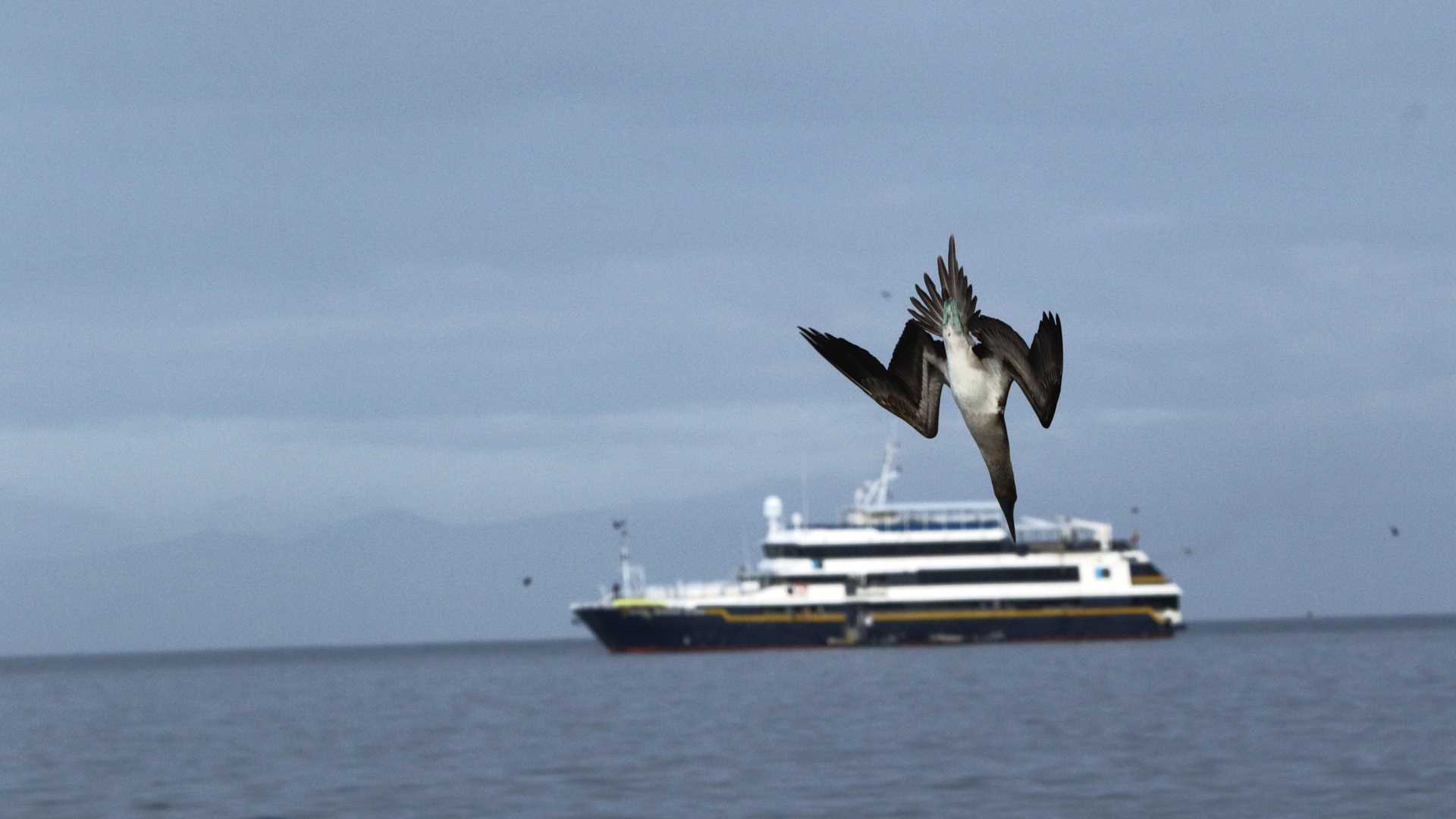 Photo caption: Blue-footed booby plunge-diving with National Geographic Islander in the back. Photo by Patricio Maldonado