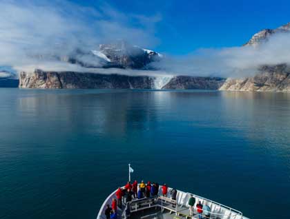 As the fog continued to clear, wisps of fog-like strokes from a painter’s brush clung to towering cliffs, as spires and mountaintops began to appear one after another. With each passing moment the scene changed and a strange thing happened—everyone out on deck was silent, except for the clicks of camera shutters and whispers of disbelief at what was unfolding before us, and in every direction. The glacially-carved landscape was on a scale that was unimaginable, like sailing into Yosemite Valley with not one, but dozens of Half Domes, which made me think of Ansel Adams and making black and white photos. The fractured, faulted, intruded, and deformed rocks exposed in the sheer cliffs date back to the Precambrian, more the 2 billion years ago when continents collided building the super-continent, Pangea.