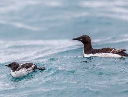 It is here high on the cliffs of Cape Hay that a truly remarkable Arctic leap-of-faith occurs. Two to four weeks after hatching on a precarious ledge, chicks weighing twenty percent of an adult, are called to sea far below them by their fathers, long before they can actually fly. The flightless journey to the sea to join their dad is fraught with danger, as some chicks are dropping to the water from heights hundreds of feet above sea level. Some chicks do not survive the impact with the surface, but those that do will go to sea and be cared for and fed by the male until the chick is independent.
