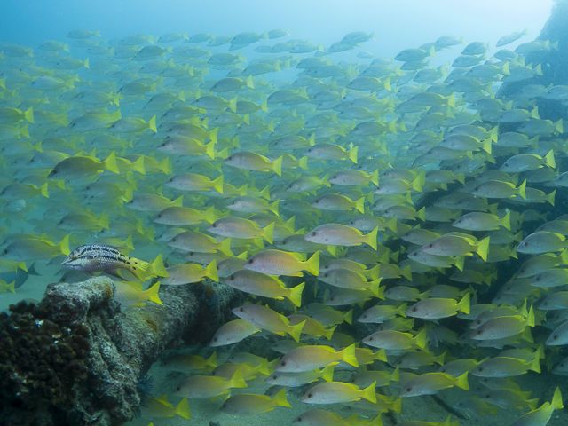 Cabo Pulmo is now full of big schools of fish and this morning we enjoyed them by snorkeling or, lucky me, scuba diving. Huge mesmerizing schools of yellow snapper, Mexican goatfish and porkfish surrounding large numbers of big predators like leopard, broomtail and gulf groupers, dog snappers and even bull sharks. What a treat to see sharks! It is believed that we have lost already about 90 % of the larger requiem sharks around the world and their presence here speak volumes about the health of the area.