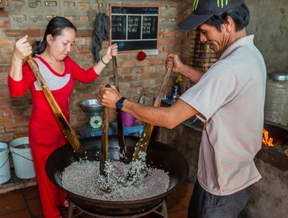 Further up the river we stop at a family-run business all based on usages for rice! We are treated to the making of rice paper by hand, harder than it looks as some of us can testify! When added to coconut and palm sugar rice can be made into a delicious candy, with special additives like ginger or garlic to mix up the flavours. Rice thrown into scalding hot black sand over an open fire will “pop”, just like our own popcorn. Once separated from the sand this can be mixed with palm sugar and other flavourings to create a scrumptious rice crispy treat! But perhaps the best usage of rice here was the distilling of rice wine, guaranteed by our local guide to never cause a hangover, regardless of how much one imbibes!