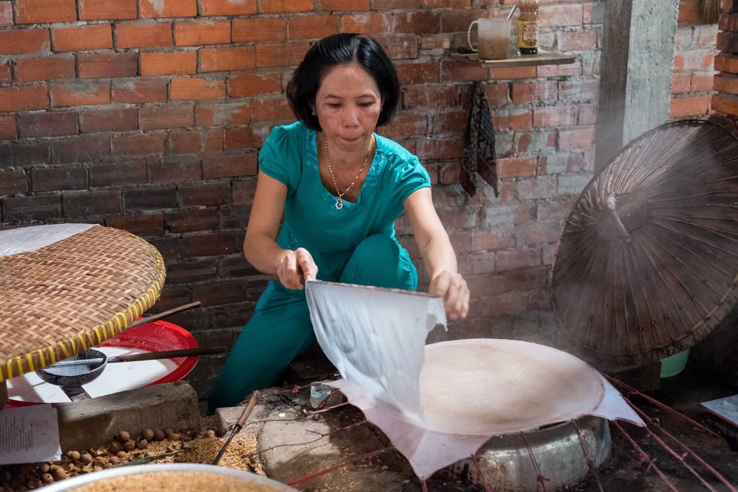 After lunch on Jahan, we take a 40 minute boat ride through narrow channels to explore Binh Thanh Island at Sadec. On the way, we see fascinating views of river life and it serves as a wonderful experience to understand the Vietnamese way of life and culture. When we get to shore, where we meet a pair of charming seniors at the local temple. The man and woman tell as their life stories and hardships as well as details about the community. The island has a kindergarten, elementary, and secondary school, but students will have to leave Binh Thanh Island if they want to attend high school. Most villagers, as far as we can see, are occupied with the weaving of sage grass mats, which involves two people. Sage grass has a very distinct fragrant smell. Some of our group try to weave the mats. Yikes – slow motion.