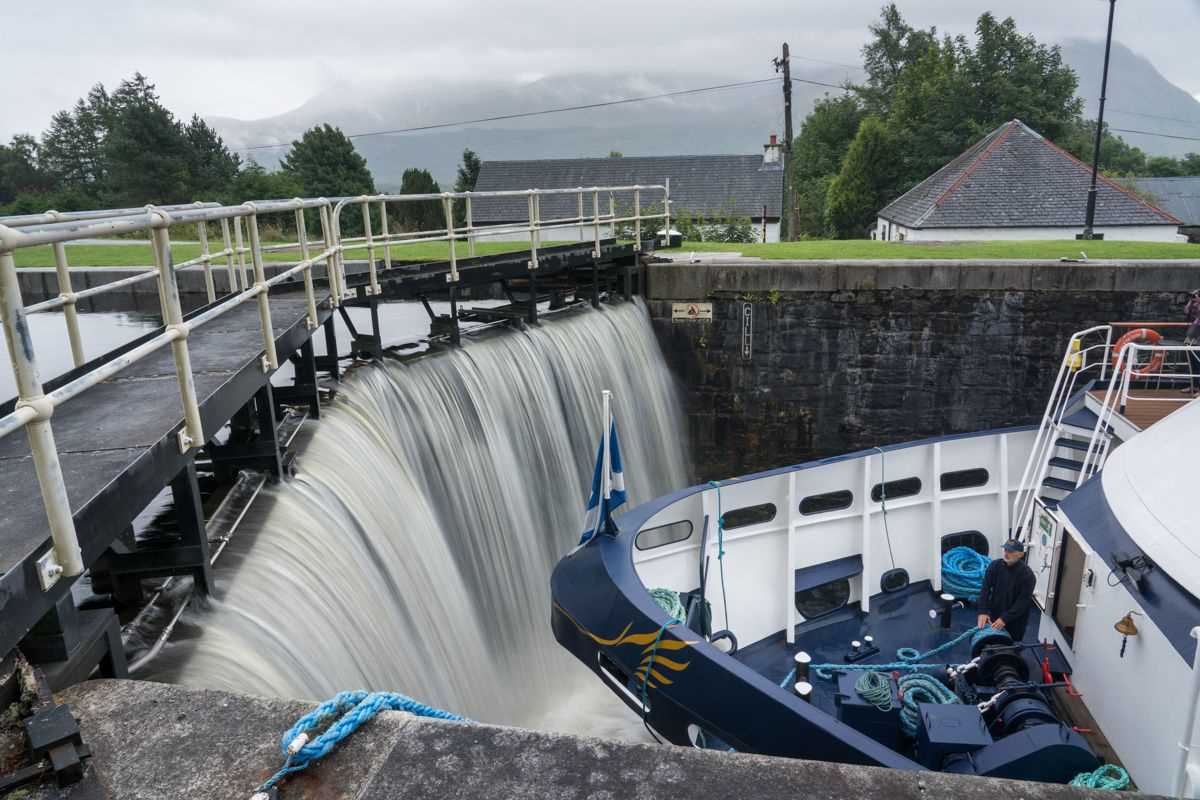 We felt its looming presence from behind trailing Scottish clouds and mist, but Ben Nevis itself, the highest mountain in Britain, was nowhere to be seen this morning. Down below, we slipped away from our berth just inside the mouth of the Caledonian Canal, and soon Lord of the Glens was ascending the eight locks forming Neptune’s Staircase.