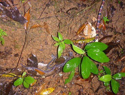 For long hikers the highlight was a coral snake eating a slender caecilian (“solda con solda” in Costa Rica). Margrit, their naturalist, was very excited about this sighting. Caecilian is an order in the animal kingdom, and it is a rare find, as they spend most of their lives hidden in the ground, making them the least familiar of amphibians. They completely lack limbs, so resemble worms, or little snakes, and their skin, like in other amphibians, contains glands that secrete a toxin to deter predators. However this characteristic did not discourage this morning’s snake from eating it. Coral snakes, together with some species of birds, are the few predators of caecilians, which usually only come out of their holes after a heavy shower; therefore this was a present from our rainy morning. It did not matter the weather, it did not matter the option, we all had our rewards and special encounters with nature.