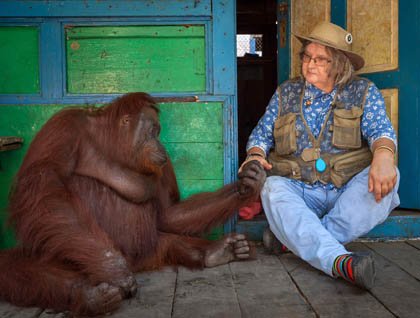 We returned to the river, boarding a fleet of local klotok boats to continue our journey upriver. The winding stream was now bordered by luxuriant rainforest as we watched for more monkeys, kingfishers, and other wildlife. Arriving at Camp Leakey, we walked to the camp’s visitor center, followed by a very memorable visit to Dr. Galdikas’ house where she sat peacefully on the low porch with her dear friend, an orangutan named Siswi, beside her. Siswi was born nearly forty years ago when Dr. Galdikas already knew the ape’s mother. Whenever Dr. Galdikas returns “home” to the camp, Siswi typically comes by to visit with her.