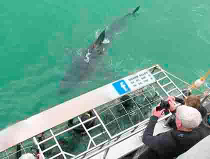 We had set out in several different groups, each with a different activity planned. First out were the intrepid shark divers, who had chosen to spend their day seeking close encounters with South Africa’s famous great white sharks. In Gaansbaai we had an excellent briefing on the biology and conservation of sharks – where we learned that electric toasters kill forty times more people each year than all sharks do. Armed with this thought, we headed down to the excursion boat and set out into the waters that are home to the world’s largest population of white sharks. Soon we were at anchor not far off a sandy beach and before we could even finish getting on our wetsuits the first shark arrived! It was Rosie, a well-known female over thirteen feet long. The first eight of us who were ready hurried down into the cage, which was secured to the side of the boat, allowing us to easily surface to breathe and then duck under to see the sharks swim by. The water was cold and very green, so underwater views of the sharks were limited, but of course the simple fact of being in the water with such a beautiful predator made it all worthwhile. And the scene from the boat was both spectacular and fascinating. We had perfect views as several huge sharks swam past the cage again and again, right at the surface, while the biologists on board told us about the work they were doing to better understand these remarkable ocean predators.