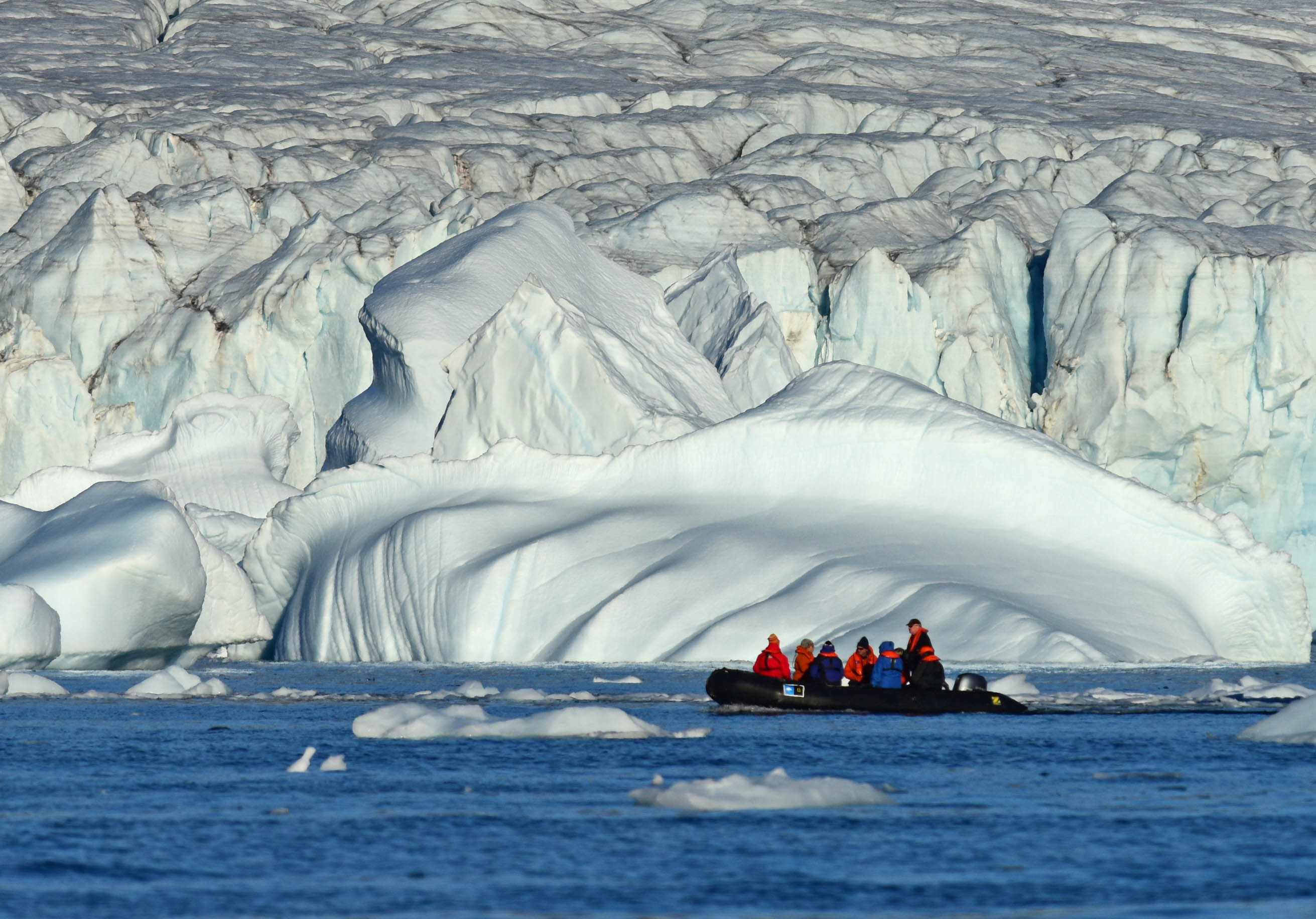 Just before breakfast, National Geographic Explorer  passed Kap York (Danish). This landmark is located at the southern end of Melville Bay. We sailed along a seemingly endless row of icebergs. These colossal slabs of  ice have calved off from the Green­land icecap. Of all the frozen fresh water on the planet, Greenland holds an estimated 9 percent  (cf. Antarctica  90% and the rest only one percent). Thus our morning exploration aimed for more close encounters with ice. Virtually all our guests joined Zodiac cruises to see glacial ice up close. We zig-zagged through–as one excited guest described it – ”a massive forest of icebergs,” right up to an impressive glacier front, in places over 100 feet high. The bright sunshine created harsh light conditions for photography. Nevertheless there were still great opportunities to capture a multitude of forms, colors, and also the tiny Zodiacs like miniature toys against the white backdrop of immense walls of ice.