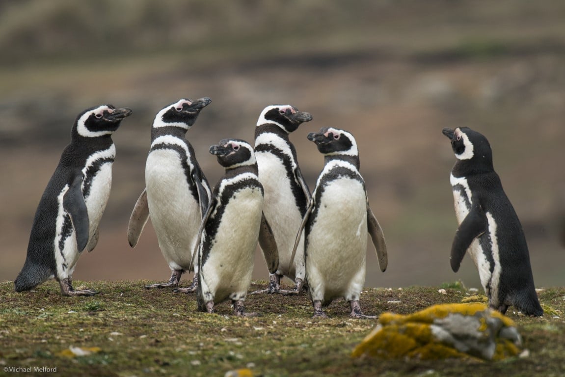 Dramatic cliffs and craggy outcrops on the west coast covered in lichens, some of them bright orange, are home to the albatross and the penguins. We made our way down through the tussac grass and came to within a few feet of these magnificent birds. The regal albatross, many already incubating their single egg, others displaying and gently preening their mates with their gorgeous, pale orange bills, were a delectable sight. The rockhopper penguins were interspersed among the albatross nests, most of them were in the process of pair bonding, with much displaying and preening each other. They were a little noisier than the albatross and their punk-like, yellow hairstyles glowed brightly. The conditions could not have been more perfect, almost no wind and the gray skies made a giant light box for all the photographers, the gentle, even light allowing subtle colors to pop out at us.