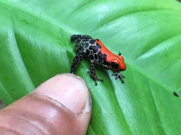 After a scrumptious and bountiful breakfast we slipped into boots and crossed to the Casual Community to hike their nature trail. Today locals foraged in the jungle leaf litter and streams and brought us things to see up close: a tarantula, a small green anaconda, and a couple of different species of poison arrow frogs. They found a sloth and one lucky group got to see her come down the tree to take care of her bodily needs and then very slowly crawl across the ground! We admired huge ficus trees and myriad liana vines. Back at the banks of the river we had a chance to buy handicrafts made using the chambira palm fiber and woodcarvings. As we motored back to the boat it began to pour—excellent timing!