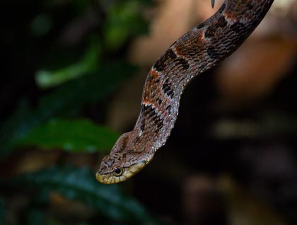 During our short walk through the forest floor we had the aid of local scouts that would find goodies of the forest for us to see. One of the most interesting creatures our scouts found for us this morning was also one of the most feared by the local Amazon people, the infamous fer-de-lance snake, one of the less infrequent and aggressive venomous snakes of the American tropical rain forest.