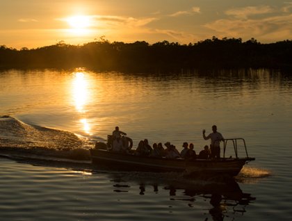 In the afternoon, we enjoyed a presentation introducing us to the Amazon area we will be exploring this week, and afterwards we once again boarded our skiffs for a journey up Rio Yanayacu. Immediately we were surrounded by pink river dolphins surfacing around our boats, and after a spell of challenging photography, we continued on our way. The water level at this time of year is fairly high, allowing us access to some of the more remote areas which are inaccessible later in the year. We puttered around a lagoon and into a narrow overgrown channel searching for birds, sloths, massive wasp nests, and anything else that might appear. We returned to the ship in time to see the moon rise, the sun set, and enjoy a cocktail with the captain.