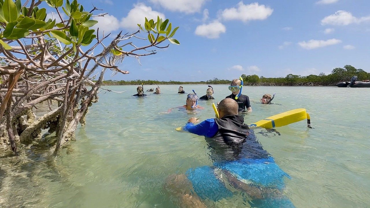 After another calm night at anchor on the Exuma Banks, we awoke to a light breeze and gentle seas. Wind and tide dictate all that we do, showing how intimately tied the Bahamian Islands are to the weather. As the sun broke through the distant cumulus clouds, the waters shone with a full spectrum of blues. Most everywhere we have been on this voyage has been in shallow waters, and we have the delight of seeing the seafloor during our travels. This gives us the privilege of peeking in on the lives of the fish, nurse sharks, coral, and other marine animals that are often obfuscated by more turbid waters. The weather obliging us thus far, it looked like a great day ahead. In the morning, we set out via kayak and Zodiac to explore a cut going through the whole of Shroud Cay. This winding channel drew us in with its beautiful waters, urging us further as its serpentine curves dictated our route. Red mangroves lined the sides as far as the eye could see. Yellow warblers sang from their branches, green sea turtles darted below us, and a lemon shark swam by in the shallow waters. Approaching the windward side of the island, we encountered the “washing machine,” a tidal cut where the channel meets Exuma Sound. Many of us hopped in the water, floating down this strong current before it deposited us safely on a sandbar. It was a delight to experience this natural playground and to cool off after a morning in the sun. In the afternoon, we spent time enjoying the pristine white sandy beaches offered by the Exumas Land and Sea Park. It was pleasant to relax, to take in the scenery and landscape around us, and to get lost in the gorgeous blue waters. Some of us took a walk up the eastside of the island as a few white-tailed tropicbirds circled overhead. These seabirds use small crevices in the limestone to nest, a feature that is plentiful in the Bahamas. From Camp Driftwood, we took in a view of the surrounding cays. We spotted Norman’s Cay, the site of a drug smuggling operation in the 70s and 80s. The DEA monitored the situation from Camp Driftwood. The Bahamas has a rich and diverse cultural history on top of its