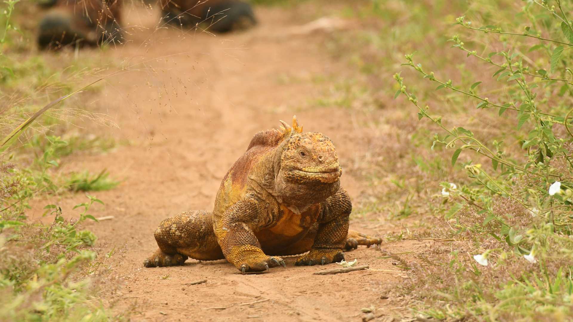 The morning was beautiful. The sun was shining, the sky was blue, the ocean was very calm, and the islands are still green. Cerro Dragon is a place with a beauty like nowhere else, with contrasts in scenery from the red shrubs covering the coast, the white sands of the beach, the black of the basaltic rock, and the green of the trees. Our captain dropped anchor in the bay, and we had breakfast and then disembarked on some wet rocks along the coast. Our first impression was wonder at the color of the Sally Lightfoot crabs on the black lava rocks. We spotted some whitetip reef sharks resting in the seabed. These sharks are very common to see while snorkeling in shallow waters. When the tide was low, we had the chance to see the sharks from land. A few lagoon birds ate microscopic creatures. The vegetation is very lush right now. We observed yellow and white flowers, butterflies, moths, carpenter bees, and finches. Right now, it is a good time for land iguanas with a lot of food available. Soon, the dry season will arrive. Most of the vegetation will die, and a hard time will come for these yellow-grey reptiles known as the dragons of Galapagos. We found many of them. Some basked under the equatorial sun to warm up, while others came out of their burrows after spending the night in their “garages” to keep warm.