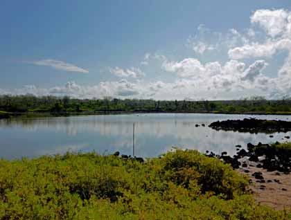 It is 8:00 am when we disembark to visit Dragon Hill, a magical place due to the contrast of the colors along its coast: black lava mixed with small white sand beaches, green-purple sesuvium shrubs and very green salt bushes decorate the shore, and several brackish water lagoons reflect all those colors of the vegetation in their waters. A few yards inland, gray Palo Santo trees make the contrasts even more vivid. Along the shoreline, we find several pelicans and blue-footed boobies. At the intertidal zone, a solitary striated heron waits for tiny fish in the pools, and above the sand dunes, a couple of marine iguanas are mating to ensure the endurance of the species in this very dramatic environment, where survival is the main goal every day for animals and plants alike.