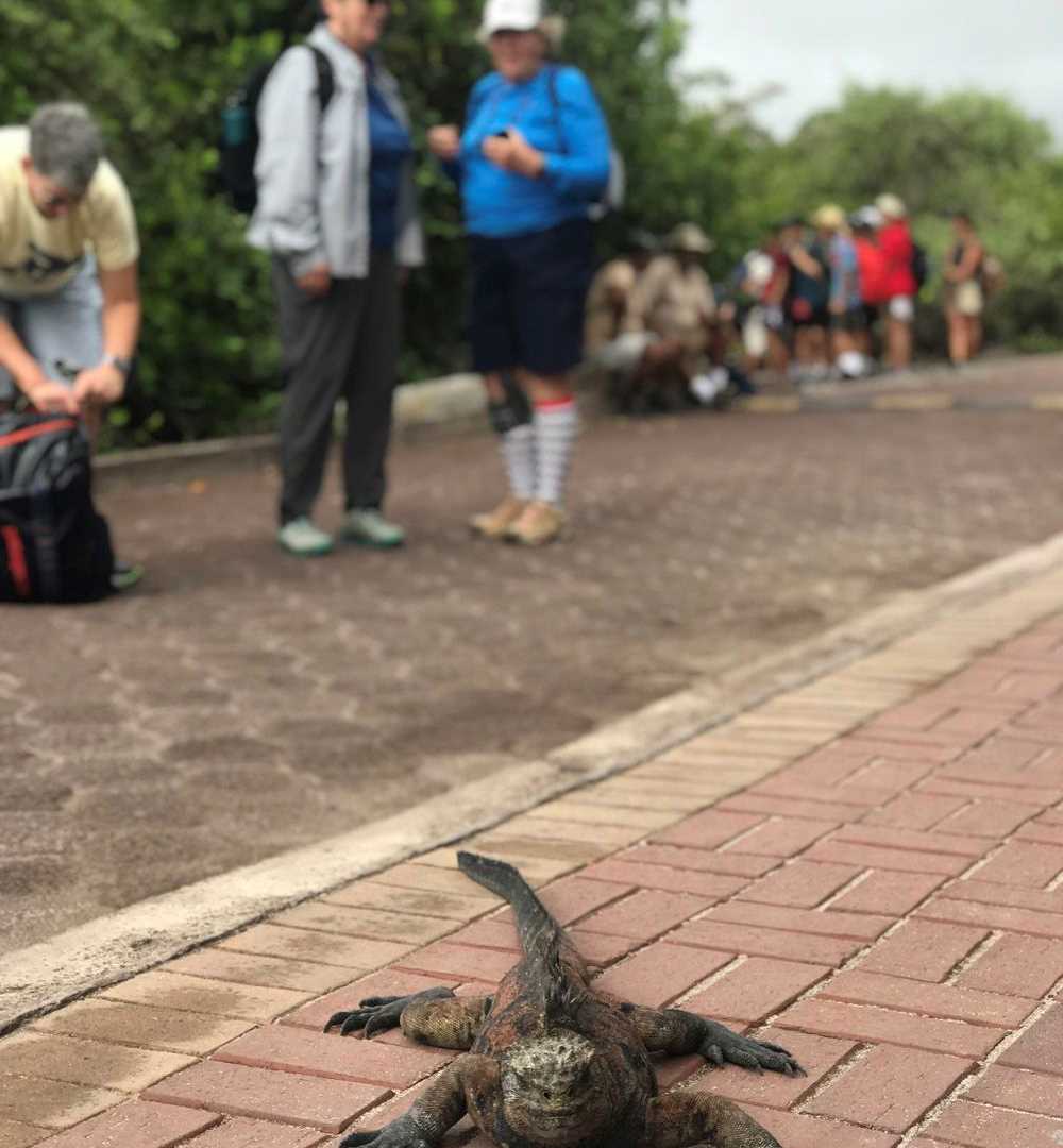 In the late morning, we visited the lush highlands of Santa Cruz. Some of us stopped to visit a charming school, Tomas de Berlanga, with outdoor classrooms. We descended into a lava tunnel, sampled coffee, moonshine and sugar cane juice at El Trapiche farm and then all gathered for lunch. At Rancho Manzanillo we enjoyed a bountiful buffet meal and then walked among and photographed giant tortoises. Tortoises were soaking in a pond, others rested, or slowly walked, fed on the short green grasses and went about their unconcerned lives.