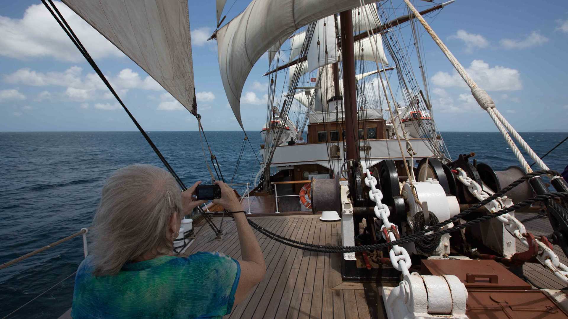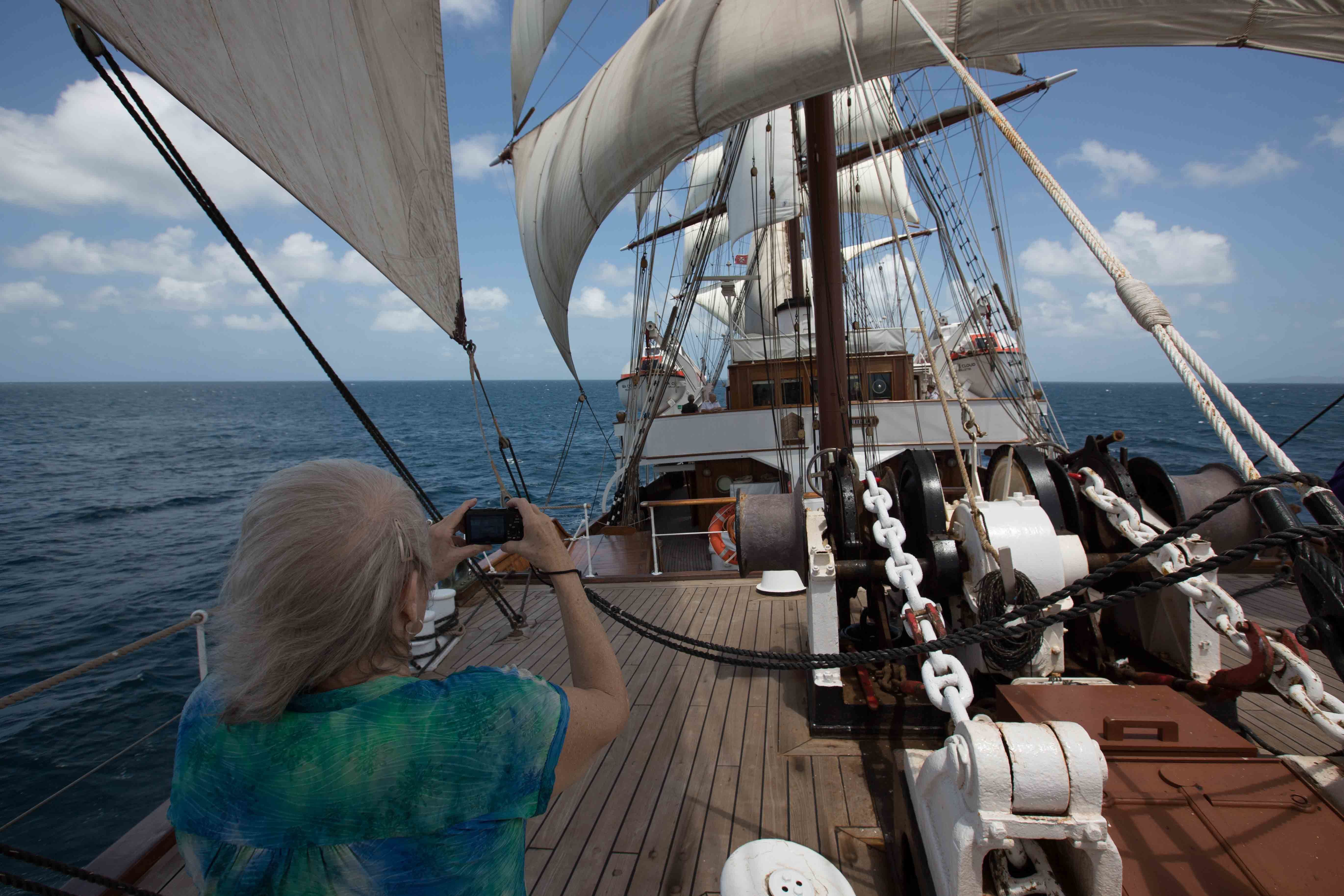 The sun rose over St. Vincent at 6 a.m. The wind was 17 knots from the east/southeast and perfect for sailing. We achieved a nice speed of 7.1 knots by 10:30 a.m. as Tom Heffernan gave a talk on the religion of Rastafarians. We anchored in Chatham Bay at 1 p.m. and were shortly landed on the lovely, sandy beach. Union Island is tiny, with an area of only three miles, and has two villages, Clifton and Ashton. It is part of the chain of islands known as the Grenadines. The total population of the island is three thousand, and almost everyone lives in the two villages. There is a single bus on the island but no hospital, so if an islander needs sophisticated medical treatment they have to be airlifted to St. Vincent. We were really, as the expression goes, off the grid!