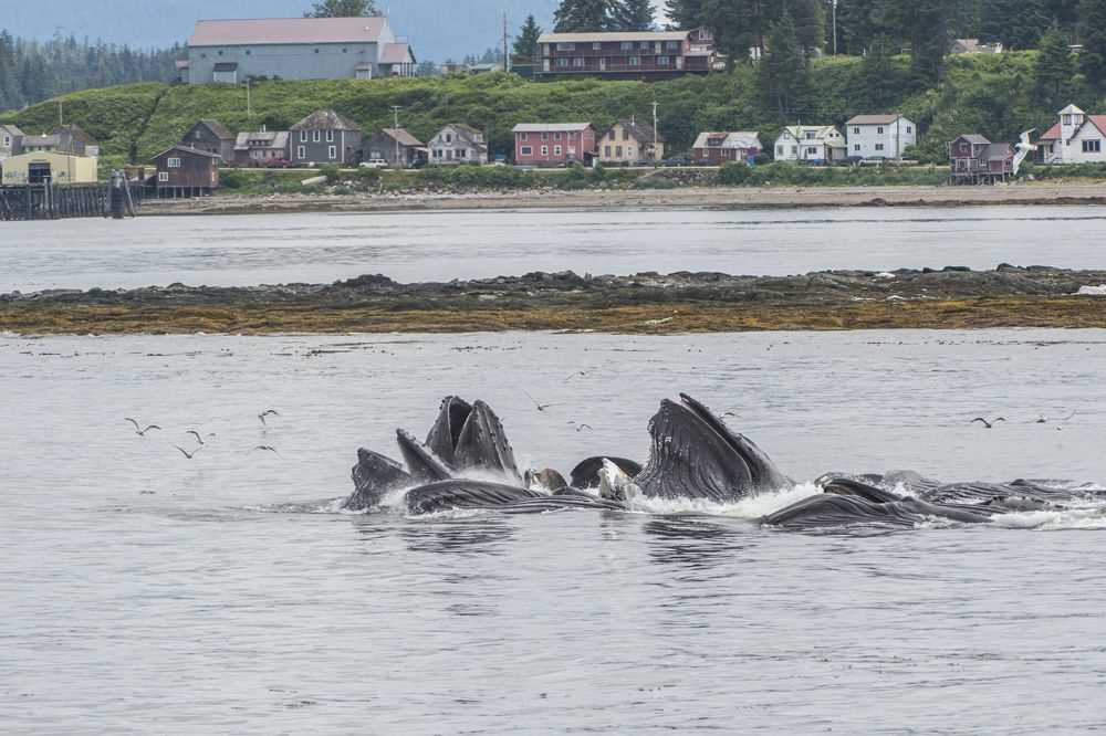 On the last full day of our expedition, we were rewarded with a truly amazing wildlife sighting—not one, but two groups of humpback whales bubble-net feeding! The whale blows were followed by sequential dives, with each whale showing its flukes before it disappeared from the surface. Thirteen flukes in one group, seven in the other. Twenty humpback whales cooperatively feeding within our view from the National Geographic Sea Bird. With the hydrophone, we could hear the two distinct calls of the “singers”, one from each group, as the whales corralled the herring from the depths of the sea to the water’s surface. Mesmerized, we watched the humpback whales blow, dive, and surface in unison, and then repeat the pattern that never ceased to amaze us. After an exciting morning, we crossed Chatham Strait, drenched in sunshine, and entered Peril Strait, in search of our last shore adventure.