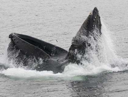 The weather continued to improve, becoming downright warm, as the ceiling overhead lifted, and the threat of rain seemed to vanish right before our eyes! The decision was made to give another photo presentation, and as usual, it worked like a charm. About halfway through it, the expedition leader walked into the lounge and announced that there was a lunge-feeding humpback whale ahead; lecture over!