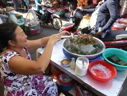 Alighting on shore, walking through a narrow alley, a buzzing scene exploded into view as we spilled into the centre of the local marketplace, caught our breath, senses of sound and smell overwhelming. Weaving our way to a clearing by a temple we then boarded the favourite local transport, vinyl art deco seats attached to bicycle wheels powered by two human legs! They’re really quite comfortable and are the best way to melt into the street scene in Vietnam. And there is nothing to block your view of the action around you! After a tour of the surrounding streets we were given free time in the market – so much to see! Dragon fruits and hairy Rambutans, bananas reached out their inviting yellow fingers from woven reed baskets. Women recited endless chants to declare their wares, a woman on a motorcycle stopped to pick up ‘drive through’ takeaways in a plastic bag that would be used to bring a goldfish home from the pet shop. Everywhere the lively hum of foreign scents, sounds, accents and most interesting activity. A quick visit to a local family’s floating fish farm was an excellent chance to get a closer look at river livelihood.