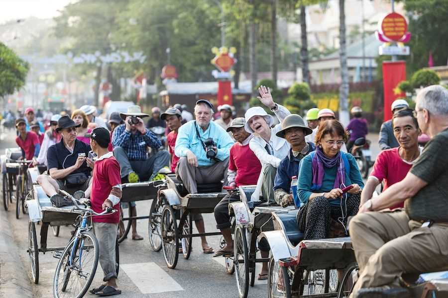 Once ashore we experience another form of local transport, the bicycle rickshaw. These two wheeled buggies are towed along by a bicycle and give us a relatively smooth ride around the streets of Chau Doc. Finally, we spend some time exploring the local street market, where we encounter a range of fresh fruits, vegetables and flowers – especially the apricot blossoms and the orange/yellow marigolds in preparation for the upcoming Tet new year festival.