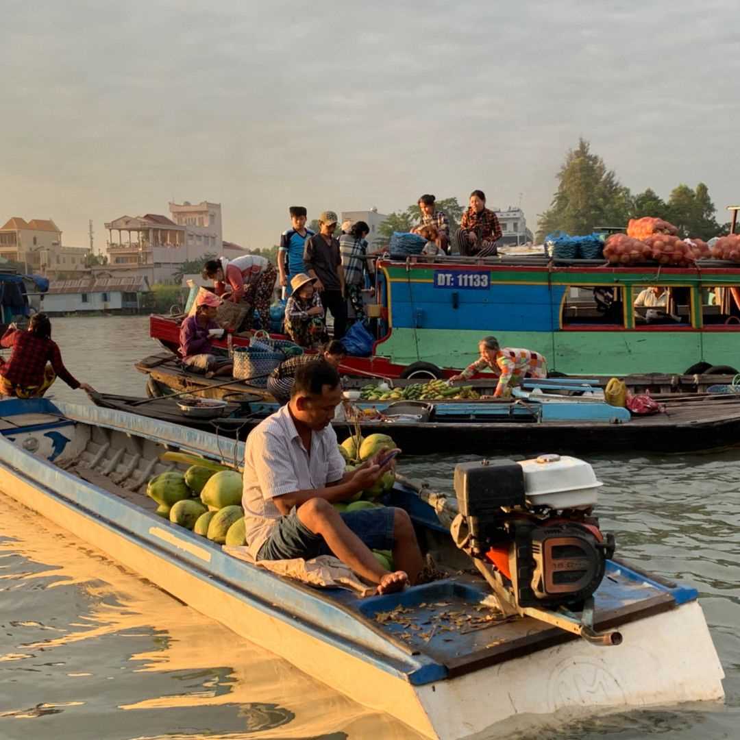After Chau Doc, Jahan set sail for Cambodia, first cruising through the manmade Tan Chau Canal, a waterway that connects two main branches of the Mekong River that flow from Phnom Penh. Along the banks are lined with hundreds of rice factories, fish farms, and boats transporting rice husks, fish, vegetables, and fruit.