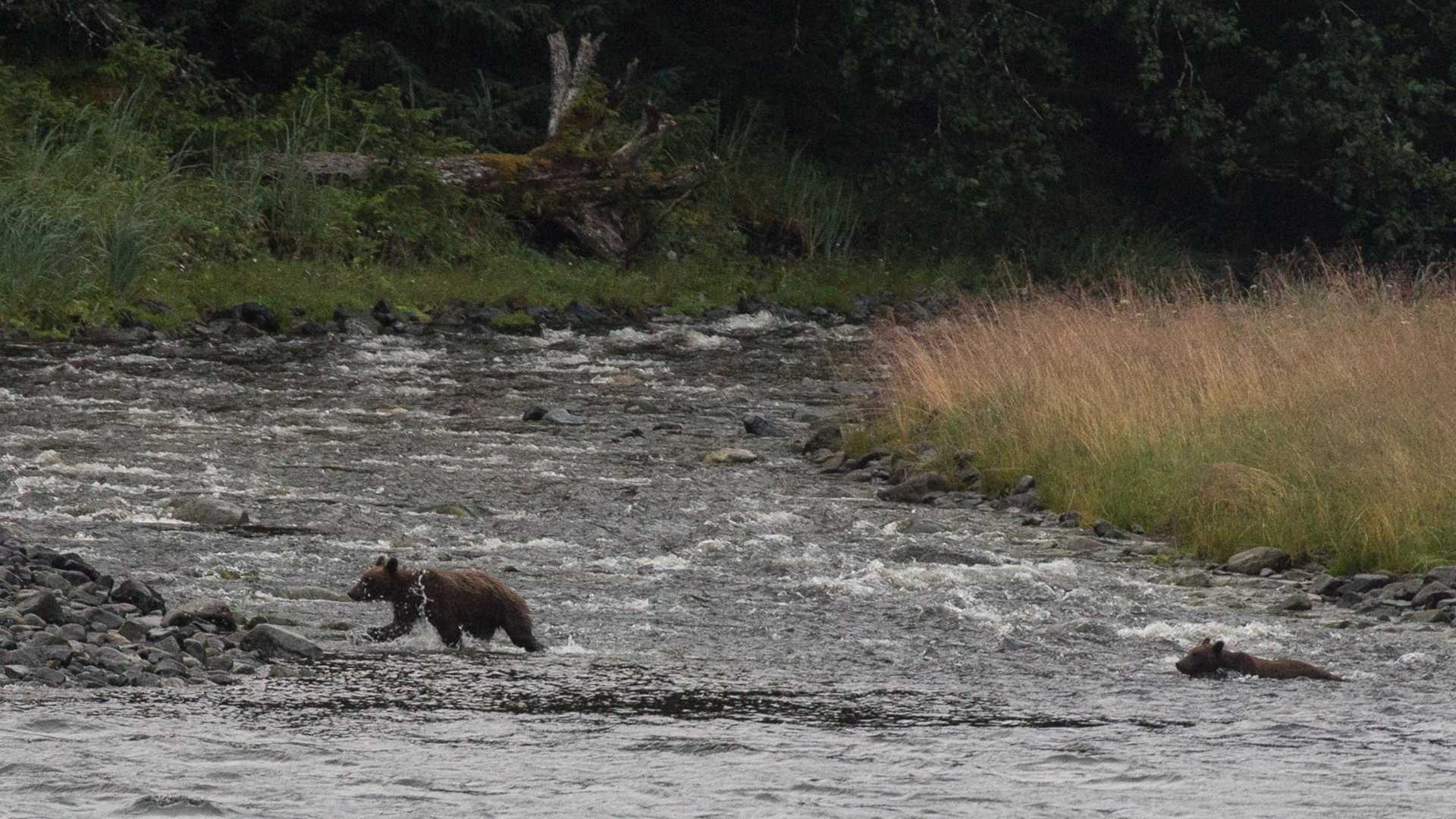 El dia de los osos! Not one or two, but a total of six brown bears were seen today on the shore of Chicagoff Island we began our exploration of Southeast Alaska. The first two bears were a young pair recently released from their mother’s care. Rather small, thin and apparently very hungry, they explored the upper intertidal for food. Later, but still before our lunchbreak, two large brown bears were seen also in pursuit of food along the intertidal near a small salmon stream.
