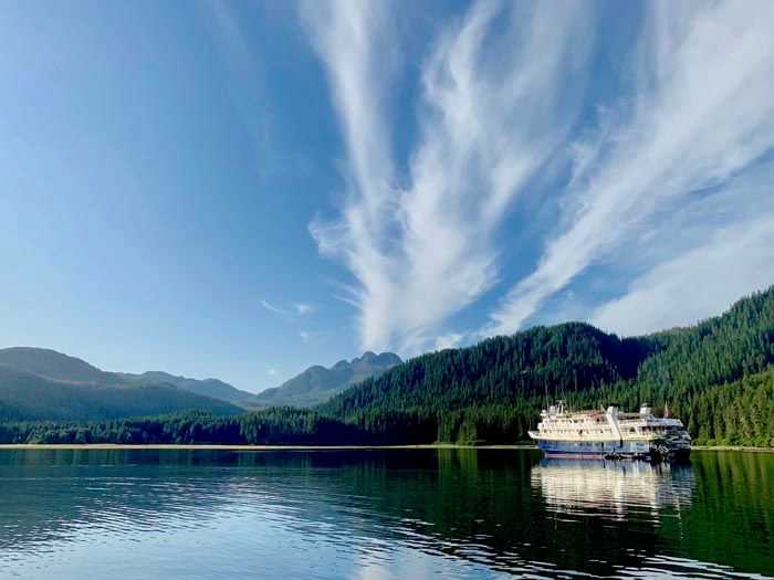 The calm waking tone of the expedition leader coupled with blue skies and sunshine greeted us once again this morning, thus setting the mood for yet another exciting day in Southeast Alaska.  After a hearty breakfast, National Geographic Sea Lion anchored in the gorgeous protected bay called Port Althorp on the northern portion of Chichagof Island. We explored it by kayak and on foot, admiring its solitude and wildness. The salmon stream at the end of the bay had a run of chum and pink salmon and showed recent evidence of many bears feasting. Bald eagles, ravens, and gulls dotted the shorelines as they waited patiently for some more scraps and leftovers and perhaps a catch of their own. What a wonderful place of true Alaskan wildness! Once home to a salmon cannery and a Naval Auxiliary station, the area is returning to its wild roots. The only signs of human industry that remain are the few log barges, covered with slow-growing new plants, resting on the beach.