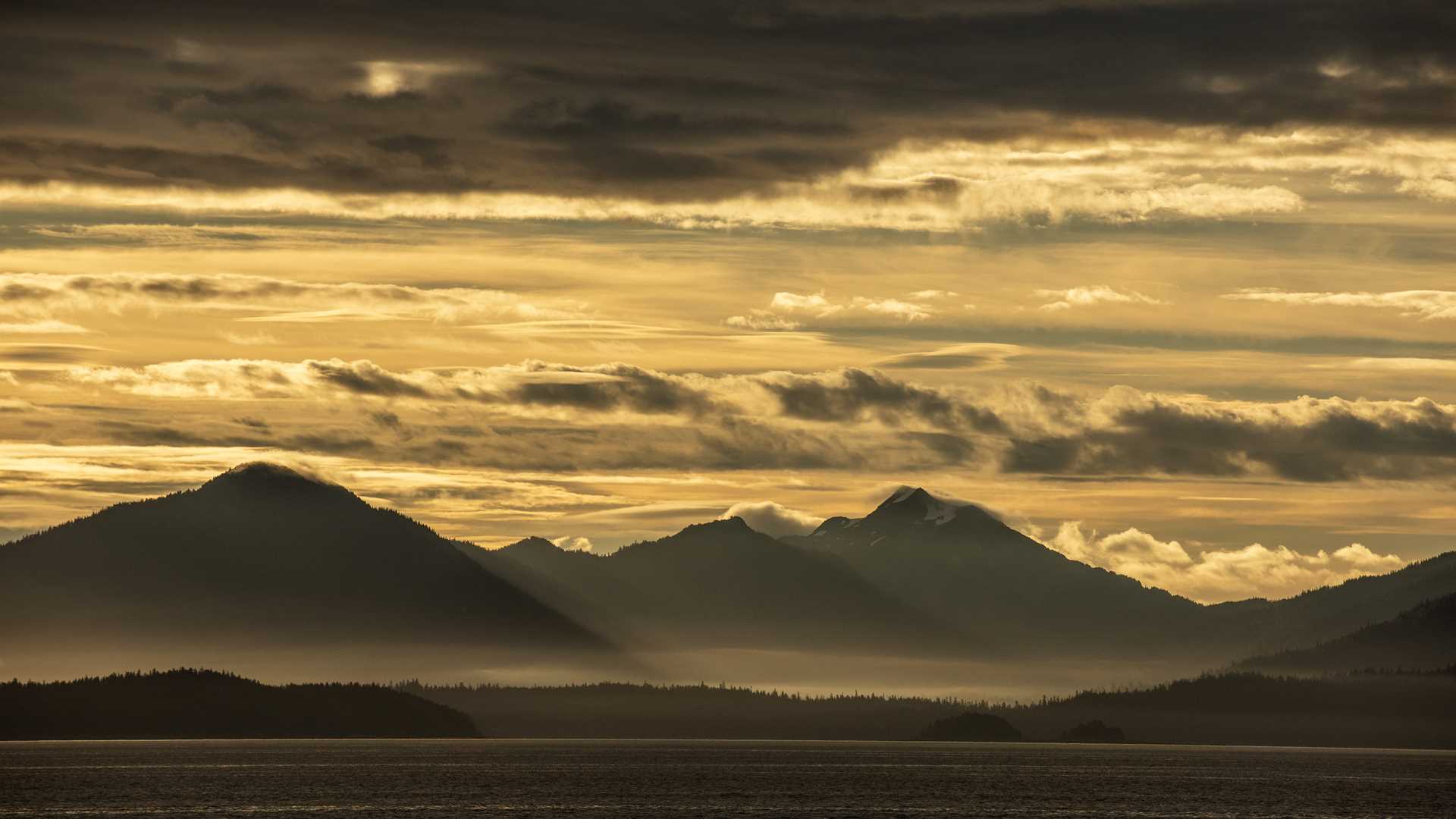 As the sun rose, National Geographic Sea Lion made her way through Peril Strait. Guests on the bow were greeted with a glorious parade of layer upon layer of gold, grey, black, yellow, and hints of blue as the sun reached through the clouds and opened up onto Peril Strait. This stretch of water separates Baranof Island and Chichagof Island. On the eastern end of Peril Strait, the entrance to Chatham Strait begins. As recently as 15,000 years ago, the ice was more than a mile thick over this strait. The moving, flowing ice exploited natural faults and lines of weakness in the bedrock of the region, gouging out valleys that were flooded by the sea when the ice finally retreated. It was this glacial ice that carved Chatham Strait and many of the smaller fjords that make up much of Southeast Alaska, often called the Land of 1,000 Islands.