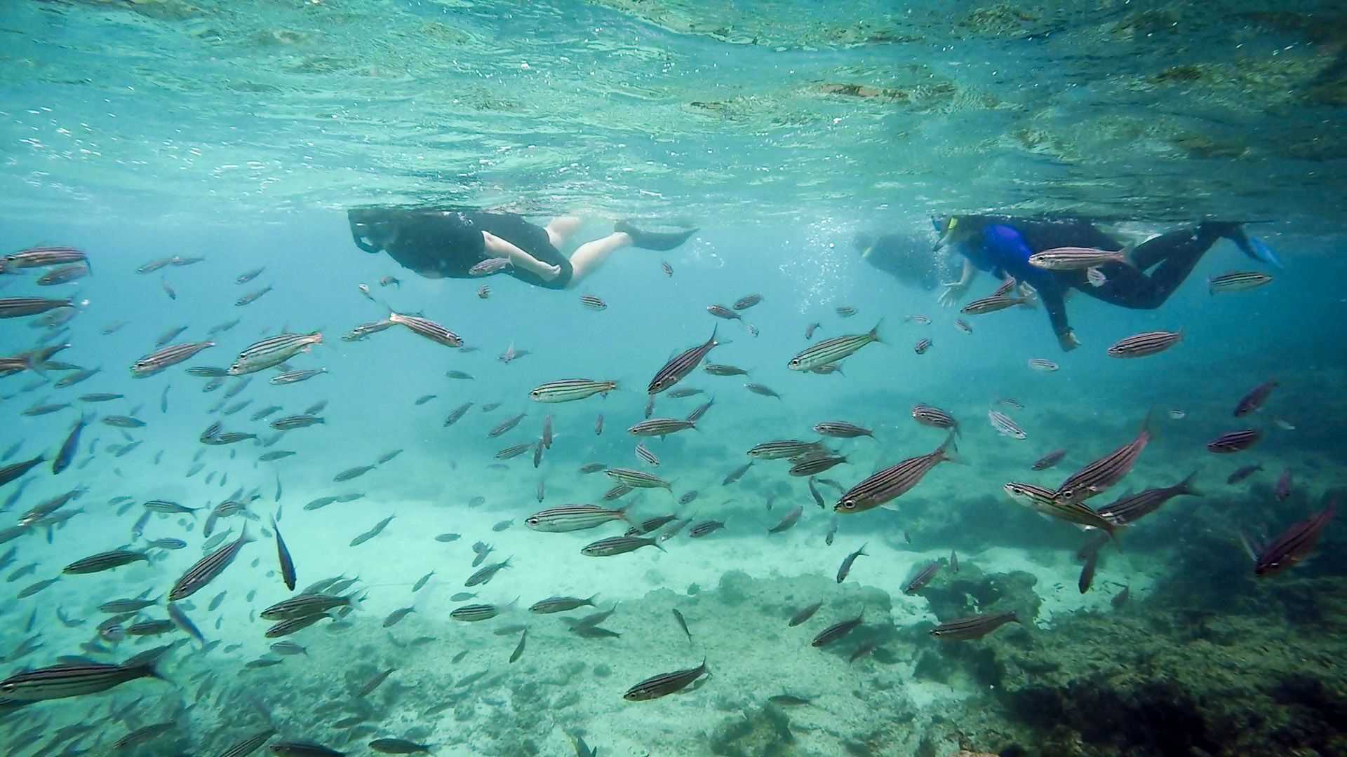 After getting back onboard we got ready for snorkeling. Our aim was to explore beneath the waves of the turquoise channel. We were lucky to encounter the best snorkeling conditions during this expedition with visibility in excess of 30 feet and a comfortable 72°F warm water. The calm waters of the channel where teeming with life. Massive amounts of young fish seemed to hug the shallow shore seeking protection from predators. This might protect them from larger predators, but not from snappers and groupers that slowly moved below only sporadically speeding up to the shallows to attack the tight schools of Black striped salema and anchovies. We even had a Galapagos penguin speed right through and around the group while chasing the small fish. The waters where teeming with life. From the colorful fish in the shallows, to the white tip reef sharks motionlessly resting bellow the ledges the rocky reef, it seemed as alive as a busy city center.