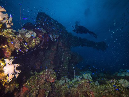 Stepping into our now familiar rubber Zodiacs we headed off across the lagoon in search of World War II history. First stop was a Japanese Zero which was shot down in combat in 1944. It was lying upside down about a meter below and still in very good condition. Next stop was a Japanese cargo and troop transport ship which lay peacefully upright in about 2 meters of water. With time quickly slipping away we made the short run back to the ship where a hot chocolate and a big smile were awaiting us. What a way to finish our first day in beautiful Micronesia.