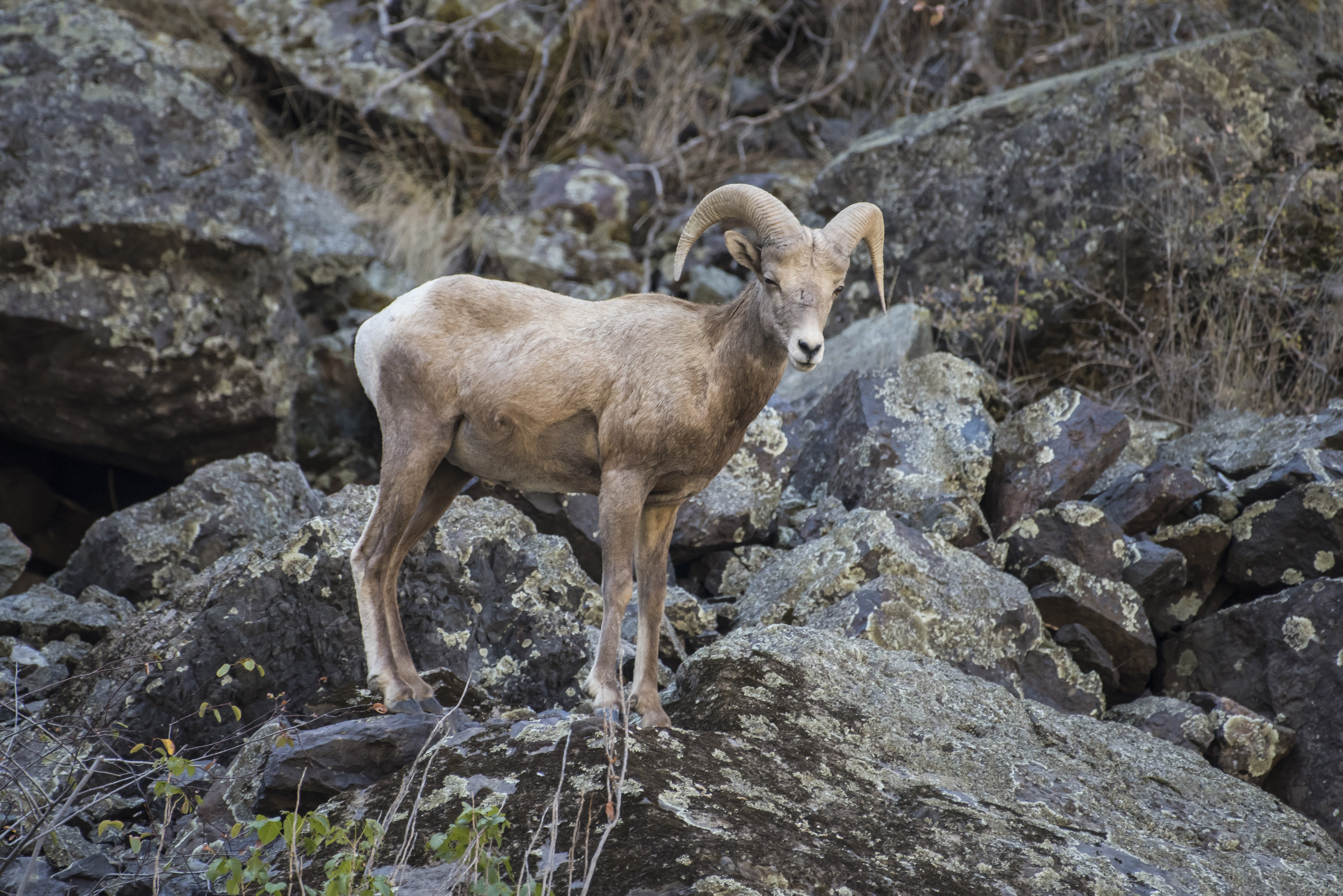 Two Rocky Mountain bighorn rams, magnificent with their great curved horns, make their way down through the rocks; we hope they will approach the river, but they are shy and mostly stay behind a low grass-covered rise. Later we see bighorn ewes and lambs feeding on willows along the river shore and have a very good look at them. The five-month-old lambs are cute and curious and come forward for a better look at us.