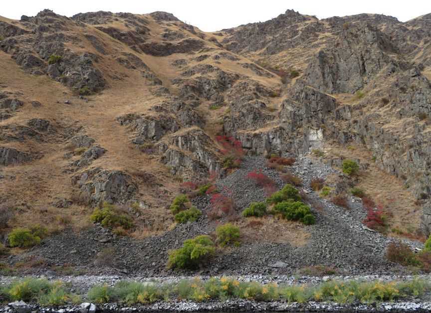 Our first stop was at Asotin (Place of Eels). Here we marveled at a beautiful outcrop of complex columnar basalt where perfectly formed columns rose above the river. Soon we were on the free-flowing Snake River. High cliffs formed by layer after layer of basaltic lava flows rose high above us. As we proceeded upstream on this cloudy morning, fall colors brightened the landscape as mulberry trees glowed golden and sumac smoldered crimson on the rocky slopes.