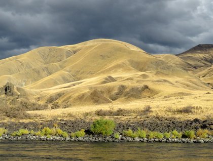 Right after breakfast we board jet boats for our trip into Hells Canyon, one of the most rugged, remote, and scenic canyons in our country. Here the Snake River has cut down through millions of years of Columbia River basalts and exotic accreted terranes to form a chasm deeper than the Grand Canyon. In the heart of the canyon, He Devil, of the Seven Devils Mountains, rises more than 8,000 feet above the river. Once underway in our jet boats the sun is shining, the air is crisp and bracing, and puffy white cumulus clouds float in the cerulean sky. Trees along the river burn bright gold in the morning sun. American coots and mallards forage along the edge of the river while small skeins of Canada geese wing their way past us, calling as they go.